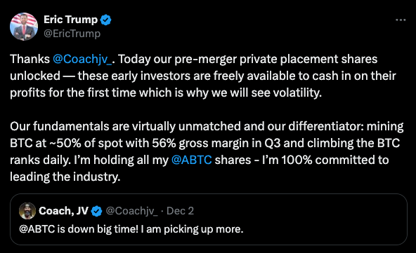 ABTC Stock Plunges 40% As Lockup Expires, Eric Trump Says Volatility Was Expected