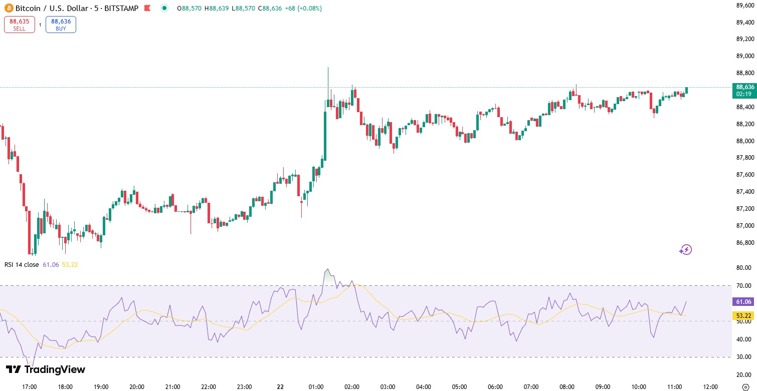 Right now, BTC is trading around $88,000. That’s a 2.5% increase. The RSI is at 62.81. That means the price has room to go higher.