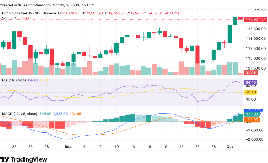 Technical indicators support the case for continued strength. Bitcoin’s Relative Strength Index (RSI) stands at 64.38, indicating rising buying pressure. The MACD histogram is widening, and the signal line remains bullish, signaling strong upward momentum.