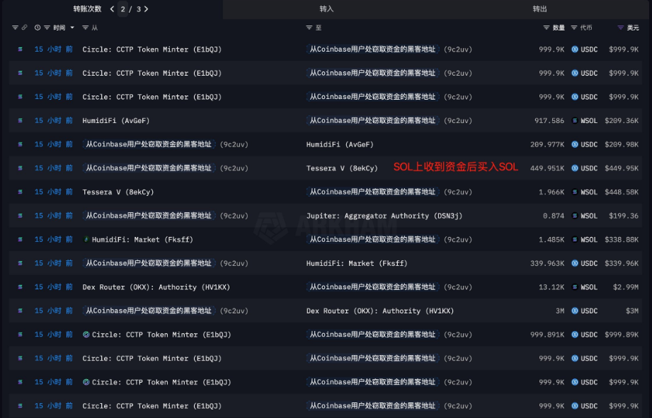The Coinbase hacker had spent stolen funds to purchase 100,913 SOL | Source: EmberCN