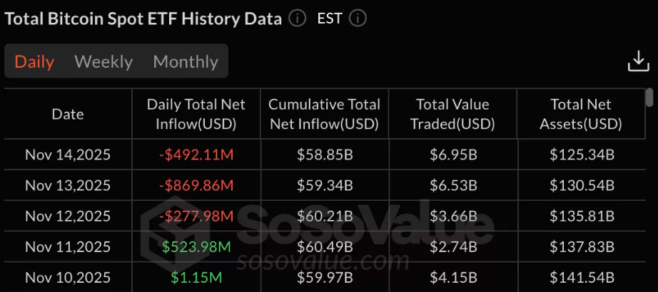 Bitcoin ETFs saw another day of significant withdrawals, losing $492.11 million on November 14. This followed a steep $869.86 million outflow the day before and $277.98 million on November 12, marking three consecutive days of redemptions.