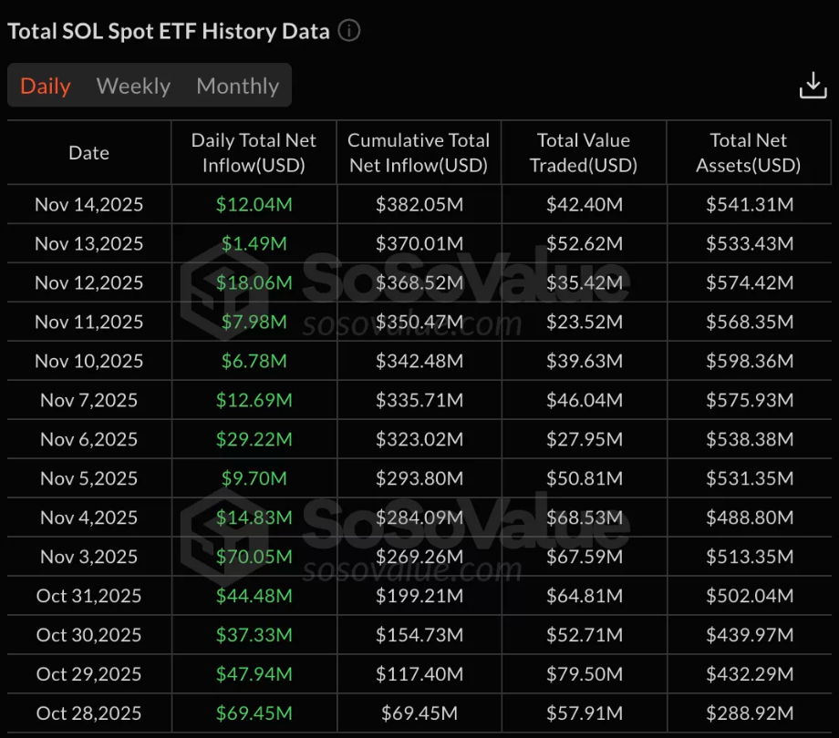 Solana funds have recorded consistent inflows since late October. On November 14 alone, Solana ETFs added $12.04 million, continuing the positive trend seen throughout the week. Earlier inflow days included $1.49 million on November 13 and $18.06 million on November 12.