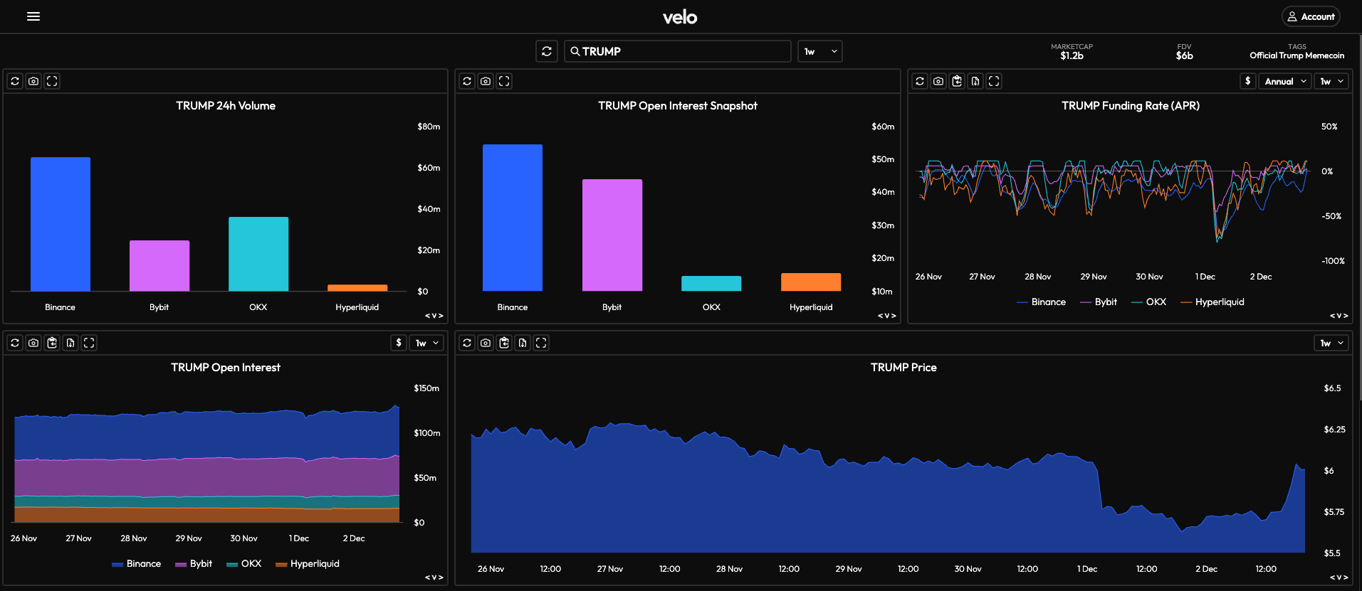 Speculative activity has dropped sharply. Total open interest in TRUMP futures has fallen 78%, from over $550 million at the start of 2025 to just $120 million in December, according to Velo.